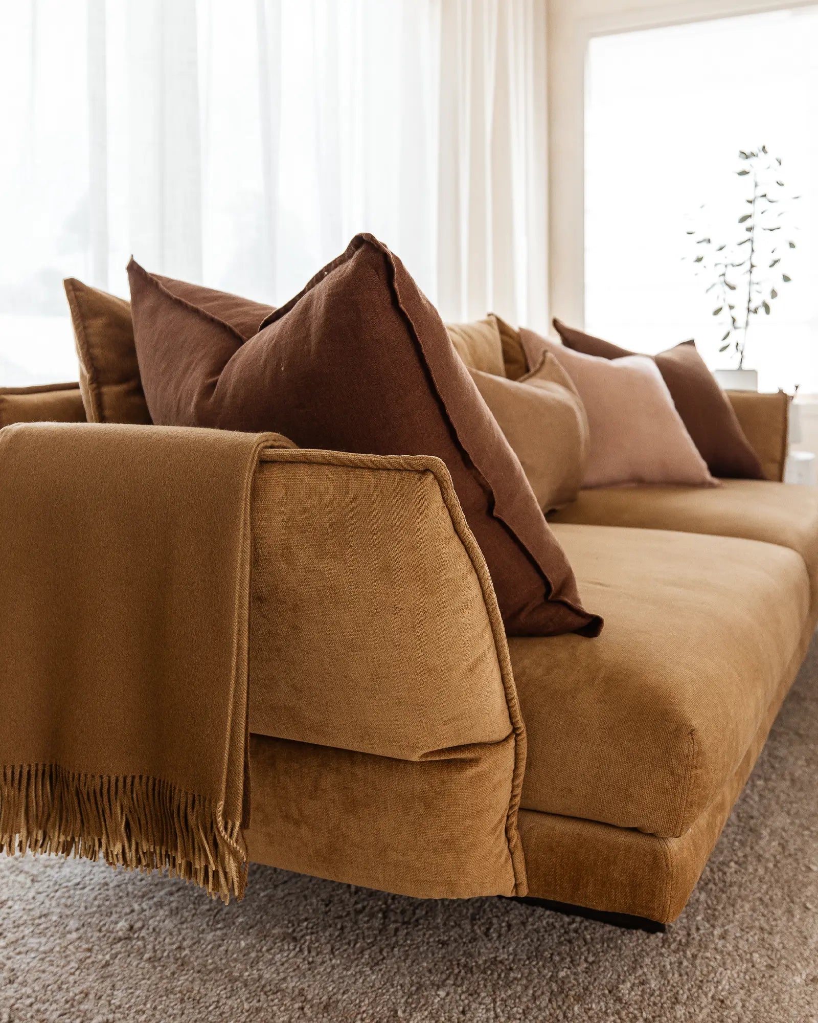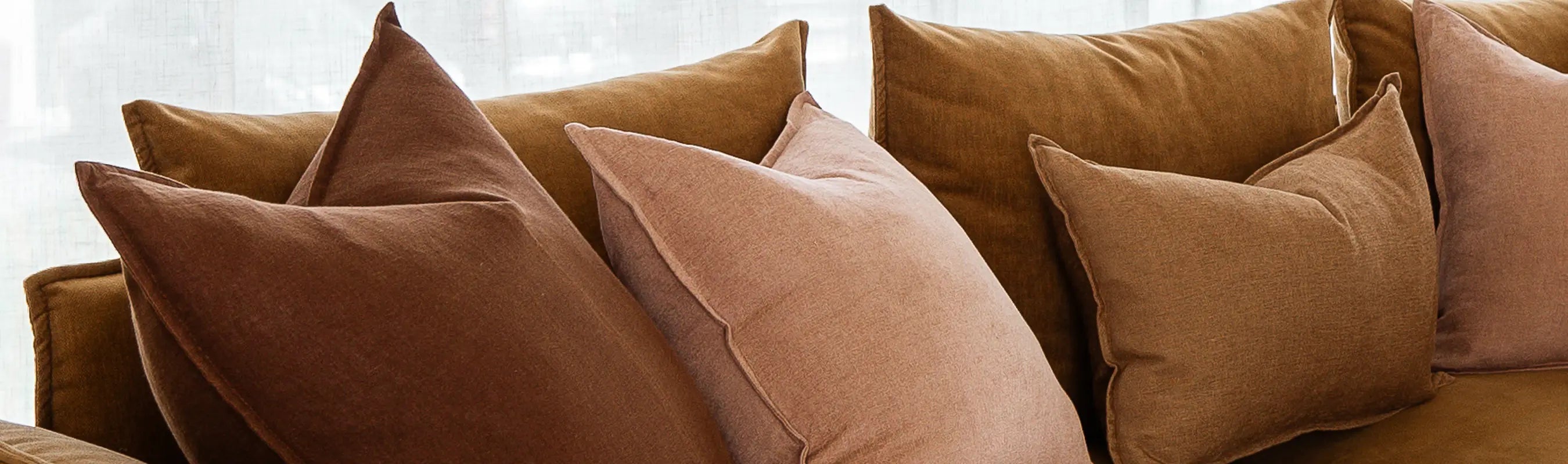 Shop the look styled by Sarah. Elevate your bedroom with our Ravello 100% European linen in Silver and Biscuit. Paired with Ava velvet cushions in Cinnamon and a striped Silver lumbar cushion, this look blends texture, warmth, and subtle pattern for a beautifully styled bed.