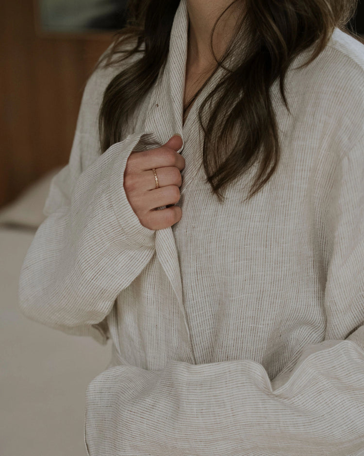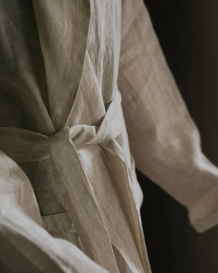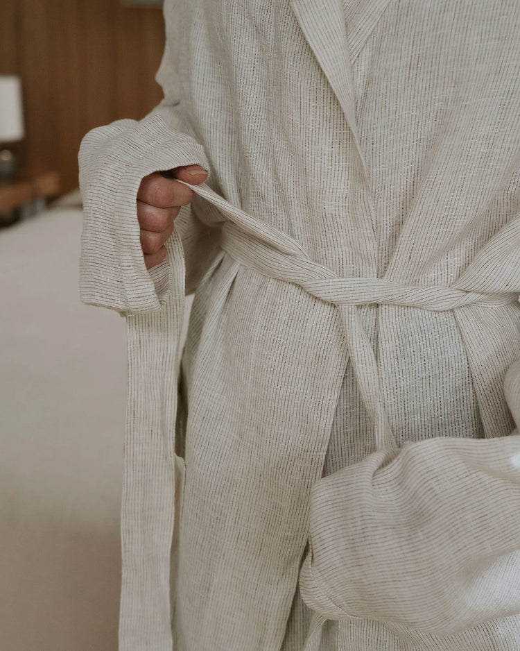 Wrap yourself in effortless luxury with the Sova robe. Crafted from 100% pure linen, its subtle pinstripe and airy texture make it the perfect companion for slow mornings, post-shower comfort, or winding down at the end of the day.